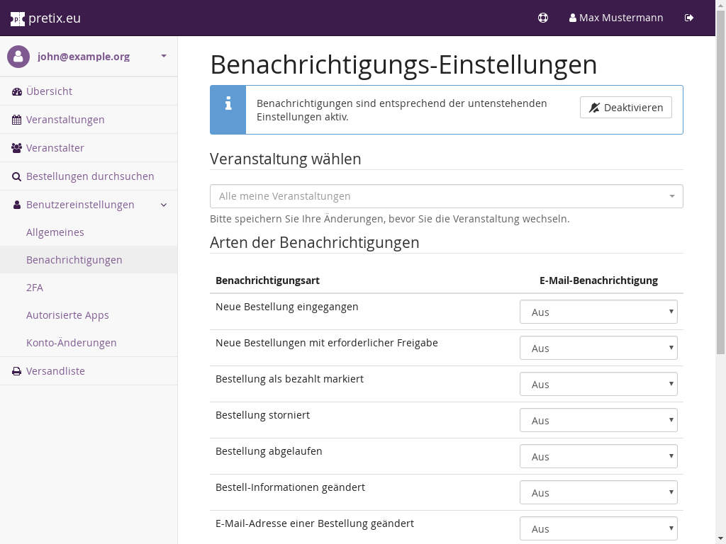 Wenn Sie immer auf dem Laufenden bleiben möchten, können Sie einstellen, dass Sie sofort benachrichtigt werden sobald eine Bestellung erstellt, geändert, bezahlt oder storniert wurde. Auf diese Weise verpassen Sie nichts, selbst wenn Ihre Veranstaltung nur wenige Registrierungen pro Woche erhält.