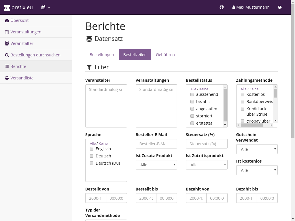 Im Administrationsbereich von pretix können Sie mit frei konfigurierbaren Berichten verschiedene Kennzahlen Ihrer Veranstaltungen miteinander vergleichen. Sie können die Daten nach einer Vielzahl von Metriken gruppieren oder filtern, je nach dem was Sie wissen möchten.