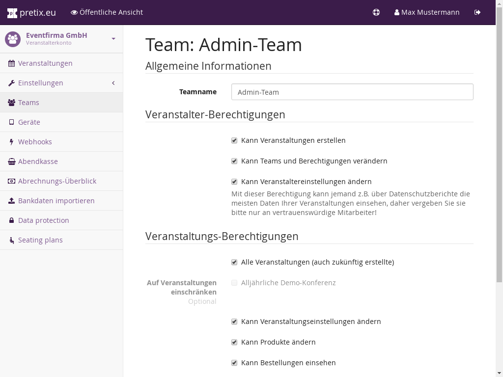 Eine Veranstaltung ist viel Arbeit und sicherlich führen Sie die Veranstaltung nicht alleine durch. Deshalb können Sie auch Ihr ganzes Team zu Ihrem pretix-Veranstalterkonto hinzufügen und gemeinsam am Ticketshop arbeiten.