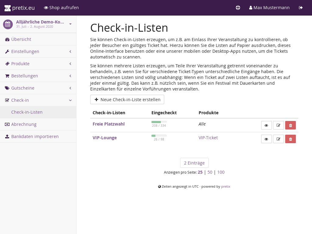 pretix bietet flexible Möglichkeiten, den Check-In Ihrer Teilnehmer zu organisieren. Sie können eine oder mehrere Check-In-Listen anliegen um zu tracken, welche Besucher bereits angekommen sind. Sie können die Listen mit unseren digitalen Check-In-Apps aktuell halten oder die Listen im PDF- oder CSV-Format herunterladen und manuell abhaken.