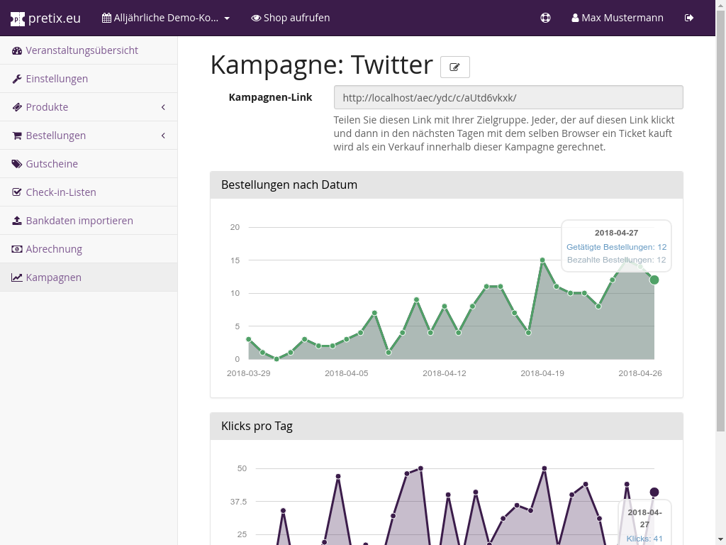 Das integrierte Kampagnen-Tracking von pretix erlaubt Ihnen, die Effektivität Ihrer verschiedenen Marketing-Kanäle zu vergleichen. Mit individuellen Links zum Ticketshop für die verschiedenen Kanäle können Sie messen, wie viel Klicks und Verkäufe z.B. der Link auf Ihrer Event-Website oder Ihre Google-AdWords-Kampagne generiert haben.