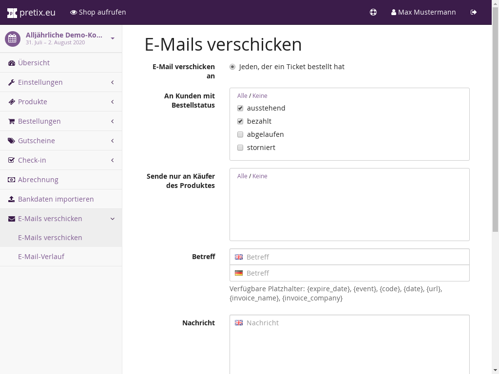 Das System schickt auch zu einigen Zeitpunkten automatische E-Mails, z.B. nach erfolgtem Bestellungs- oder Zahlungseingang. Mit pretix können Sie die Texte dieser E-Mails komplett anpassen, sodass Sie die Kommunikation mit den Teilnehmern unter Ihrer Kontrolle behalten.