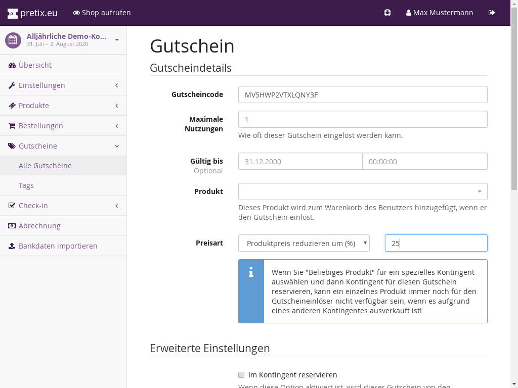 Zusätzlich können Sie mit Gutscheinen Plätze im Kontingent reservieren, sodass der Besitzer des Gutscheins in jedem Fall noch ein Ticket erhält.
