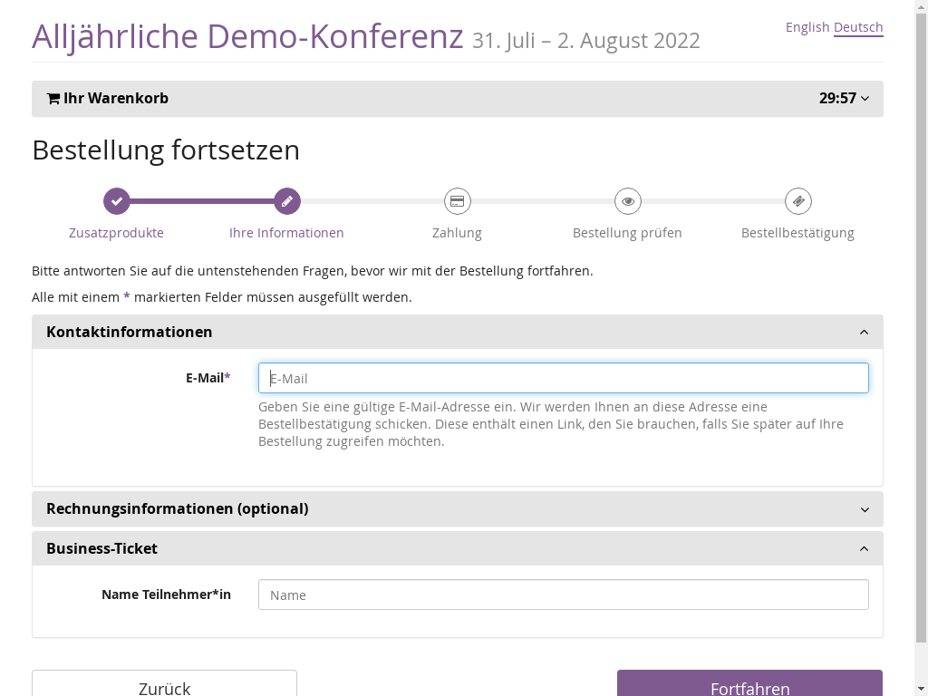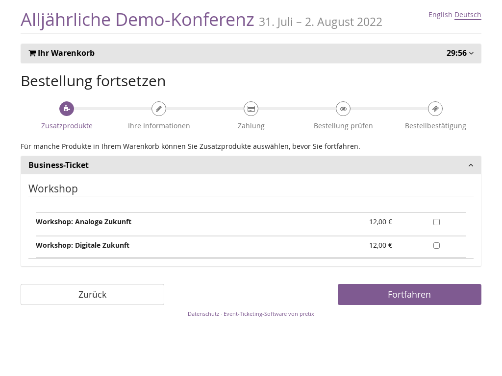 Mit Zusatzprodukten können Sie Produkt-Pakete schnüren, z.B. wenn Sie neben Ihrem Konferenzticket noch zusätzliche Workshops anbieten, die zugebucht werden können.