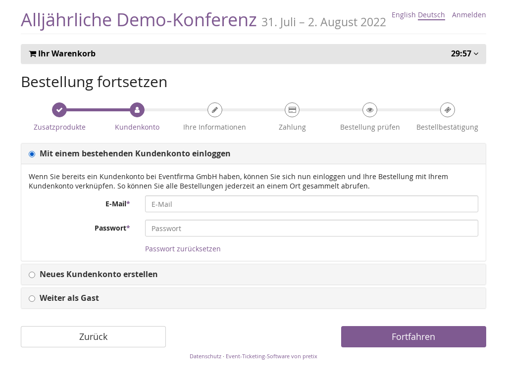 Mit unserer Kundenkonto-Funktion können Sie sich Ihren eigenen Kundenstamm dauerhaft aufbauen und Ihren Ticketkäufern die Möglichkeit geben, alle Buchungen übersichtlich in einem Online-Account zu sammeln.