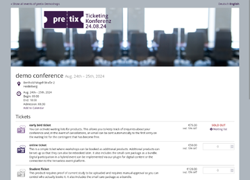 In unserem Demo-Shop finden Sie eine von vielen Möglichkeiten, wie Konferenz-Ticketing mit pretix realisiert werden kann, damit Sie sich aus Ticketkäufer*innen-Sicht ein Bild machen können.