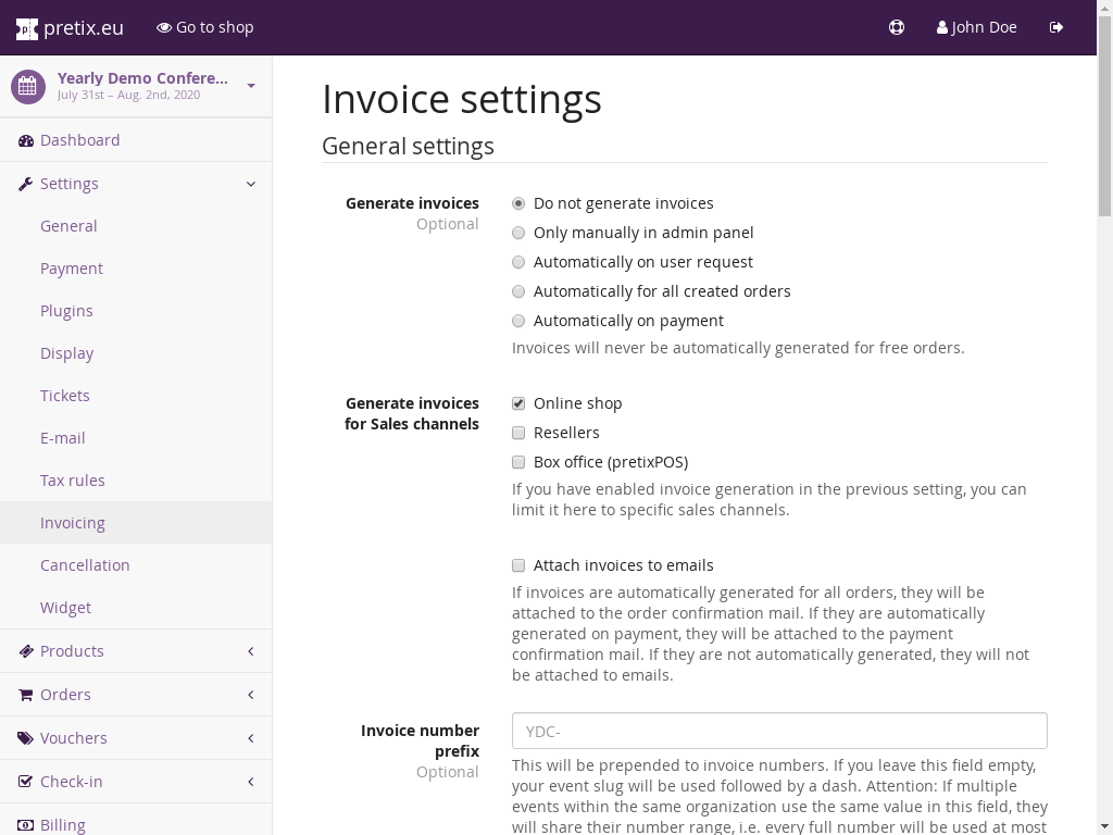 If you want, pretix can automatically generate invoices for all orders or payments. You can configure in detail everything that is printed on the invoice to adjust it to your legal requirements.