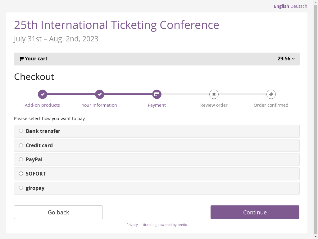 At the same time, pretix supports all payment methods that you could think of: Bank transfer, direct debit, credit cards, PayPal, Klarna, geps, and many more. Scroll down for a complete list.