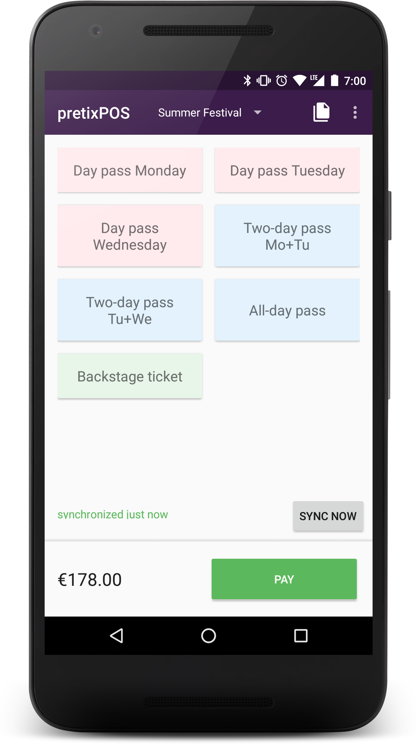 There's no need to go through extensive configuration for pretixPOS. You only need to connect pretixPOS to your pretix account and it will automatically synchronize with the configuration of your online shop and allows you to sell all your event tickets right away.